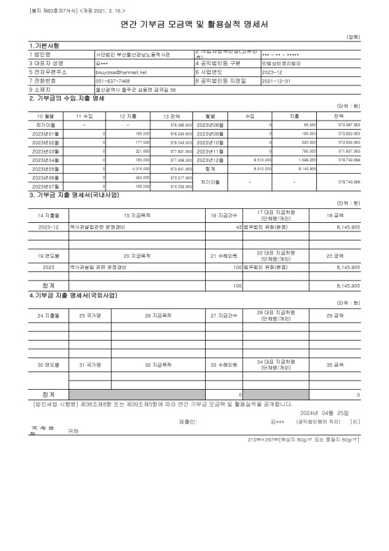 공지 2024 사단법인 부산울산경남노동역사관 기부금모금액 및 활용실적