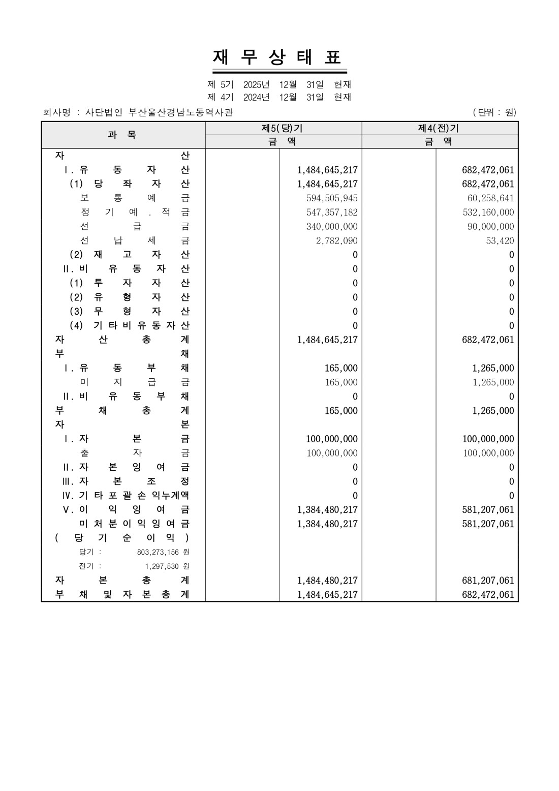 공지 사단법인 부산울산경남노동역사관 2025년 재무상태표